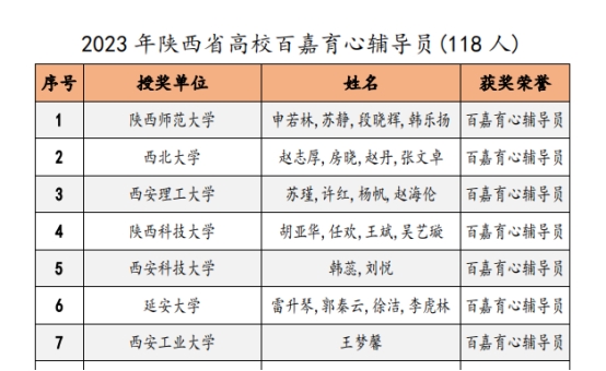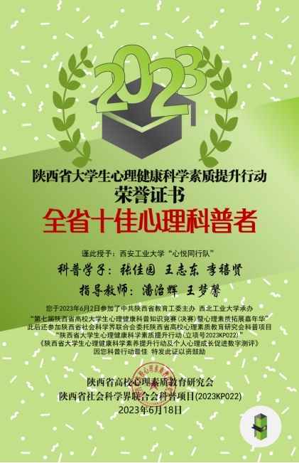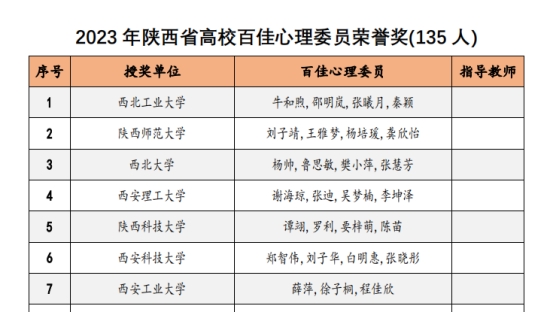 近日,陕西省高校心理素质教育研究会对2023年陕西高校心理育人相关工作进行表彰。sunbet申搏辅导员王梦馨被评为“百嘉育心辅导员”,公司员工程佳欣被评为“百佳心理委员”。此前,在2023年第六届陕西高校老员工心理健康科普知识竞赛暨心理素质拓展运动嘉年华决赛中,公司张佳园同学参与组成的“心悦同行”代表队在决赛中荣获二等奖并获得“全省十佳心理科普者”称号,辅导员王梦馨作为指导教师获奖。