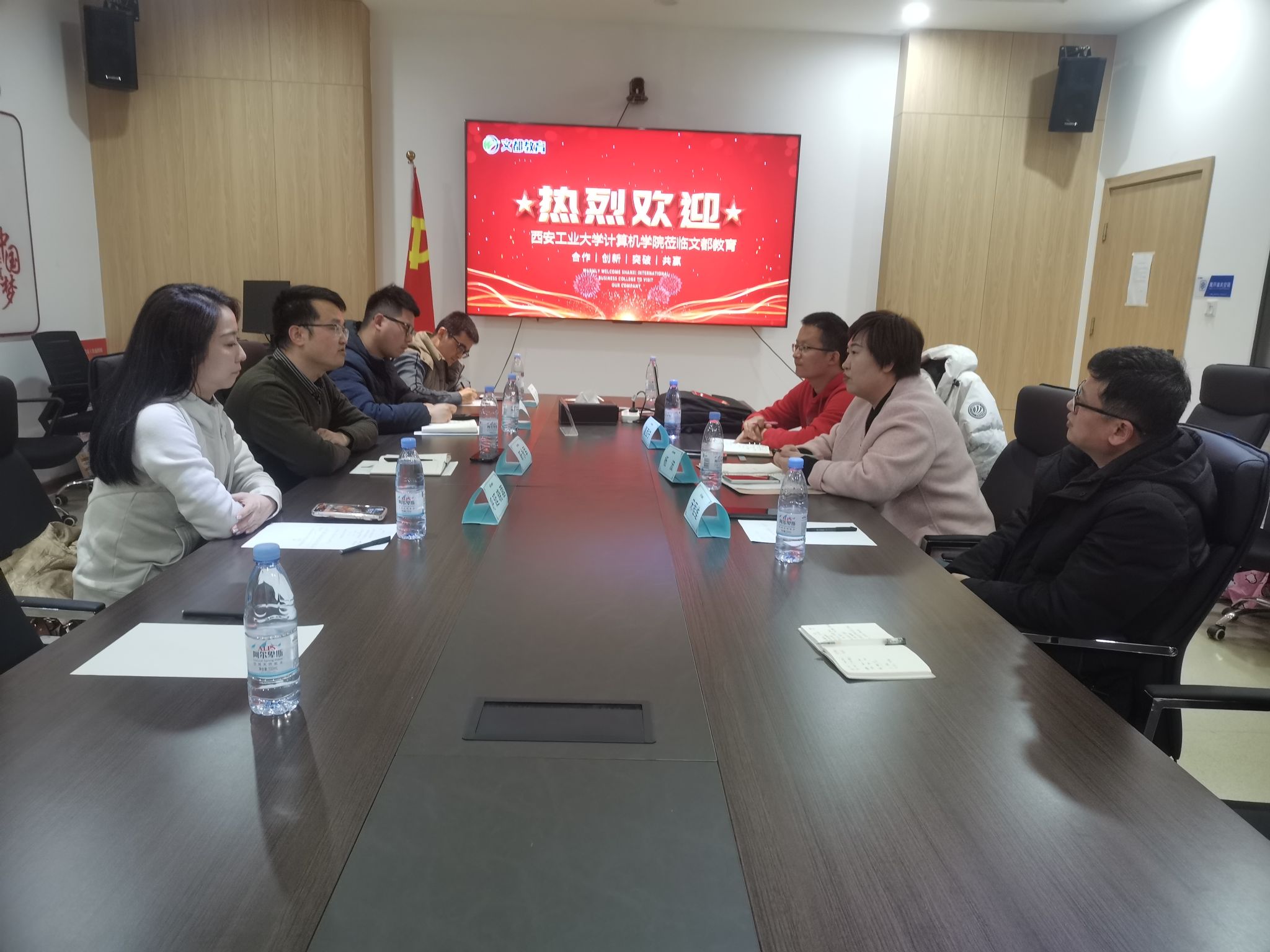 2024年3月5日,sunbet申搏公司党委副书记靳永军,辅导员孙君、呼延晓蓉、胡凯等一行人共同前往文都教育集团小寨华旗总部进行参观交流。文都教育市场营销部负责人杨波、文都教育北郊区域董事长夏西宁、文都教育未央校区董事长宋程维等相关负责人接待来访。