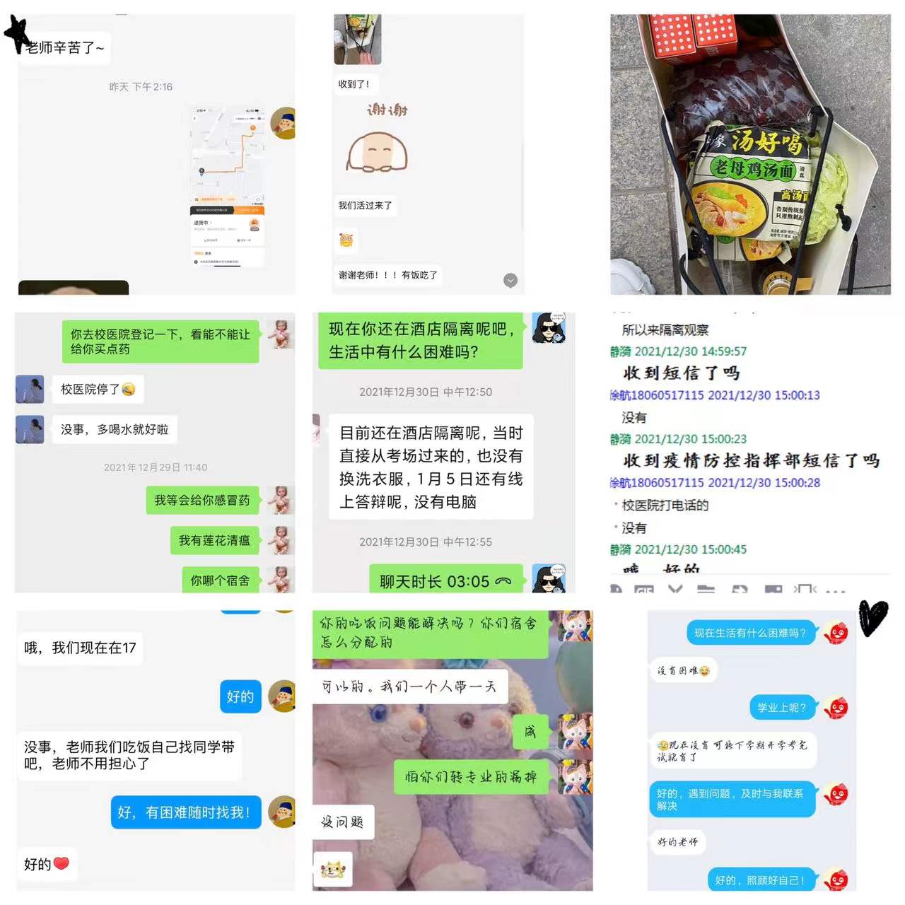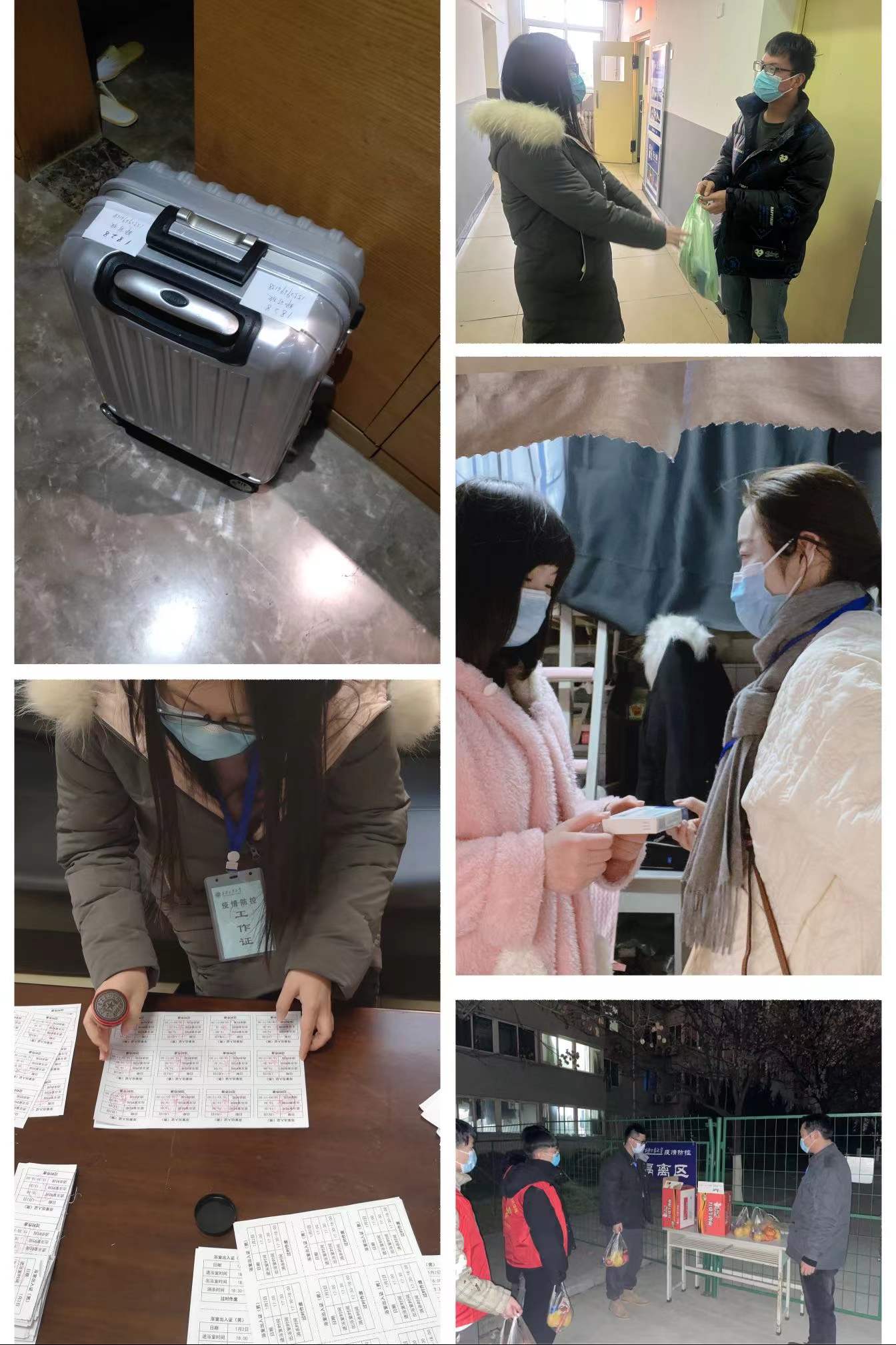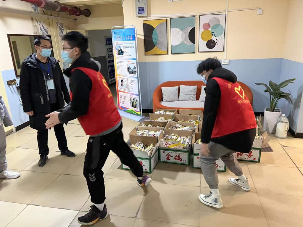 连日来,sunbet申搏对在校员工和校外住宿员工开展了一系列关心关爱帮扶行动,主动了解问题,及时替员工排忧解难。得知员工口罩不多了,辅导员孙君、吴宗原连夜“送货上门”,为员工分发口罩;为确保员工安全平稳地度过跨年夜,靳永军带领办公室主任焦建军、辅导员孙君、王梦馨、呼延晓蓉、吴宗原、于杰在宿舍内逐间走访宿舍,发放慰问品,送去新年问候和节日祝福,直到深夜;公司也时刻心系住在校外、隔离在17公寓的员工们,虽不能见面,但对员工的拳拳爱护之心,在一声声日常问候中静静流淌。考虑到隔离中的同学存在学习和生活上的困难,sunbet申搏全体学工干部想尽办法、排除万难,给校外隔离的员工送去电脑和生活用品,给校内隔离的同学送去节日慰问品;了解到两名住在碧桂园凤凰城的女生缺少生活物资,辅导员李凯及时通过UU跑腿,给两名女生送去了蛋、蔬菜、水果、速食品等食材,让员工能衣食无忧地度过新年;隔离疫情,不隔离爱,我们的每一分努力,都是为了让员工感受到在校如在家的温暖。