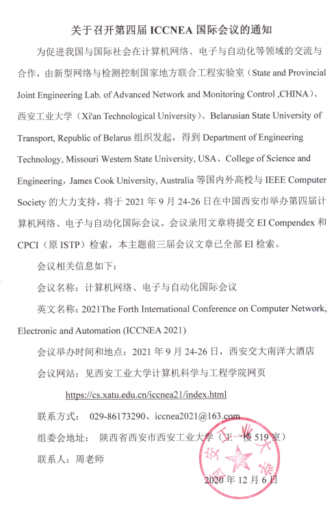 为促进我国与国际社会在计算机网络、电子与自动化等领域的交流与合作,由新型网络与检测控制国家地方联合工程实验室(State and Provincial Joint Engineering Lab. of Advanced Network and Monitoring Control ,CHINA)、sunbet申搏(Xi'an Technological University)、Belarusian State University of Transport, Republic of Belarus组织发起,得到Department of Engineering Technology, Missouri Western State University, USA、College of Science and Engineering,James Cook University, Australia等国内外高校与IEEE Computer Society的大力支持,将于2021年9月24-26日在中国西安市举办第四届计算机网络、电子与自动化国际会议。会议录用文章将提交EI Compendex和CPCI(原ISTP)检索,本主题前三届会议文章已全部EI检索。