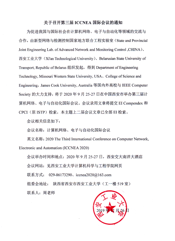 为促进我国与国际社会在计算机网络、电子与自动化等领域的交流与合作,由新型网络与检测控制国家地方联合工程实验室(State and Provincial Joint Engineering Lab. of Advanced Network and Monitoring Control ,CHINA)、sunbet申搏(Xi'an Technological University)、Belarusian State University of Transport, Republic of Belarus组织发起,得到Department of Engineering Technology, Missouri Western State University, USA、College of Science and Engineering,James Cook University, Australia等国内外高校与IEEE Computer Society的大力支持,将于2020年9月25-27日在中国西安市举办第三届计算机网络、电子与自动化国际会议。会议录用文章将提交EI Compendex和CPCI(原ISTP)检索,本主题上二届会议文章已全部EI检索。