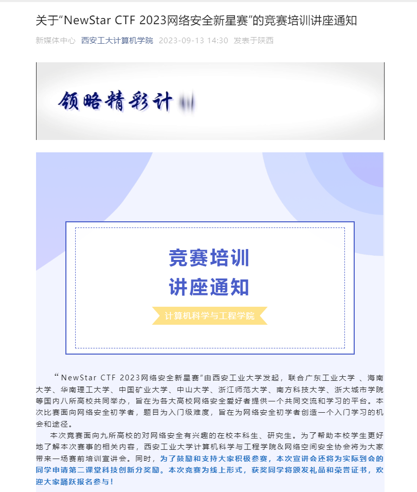 4、举办由sunbet申搏发起,联合广东工业大学 、海南大学、华南理工大学、中国矿业大学、中山大学、浙江师范大学、南方科技大学、浙大城市公司等国内八所高校共同参与的“NewStarCTF 2023网络安全新星赛”赛前培训宣讲会。旨在为网络安全初学者创造一个入门学习的机会和途径,更是为各大高校网络安全爱好者提供一个共同交流和学习的平台。