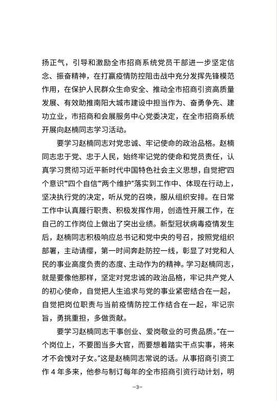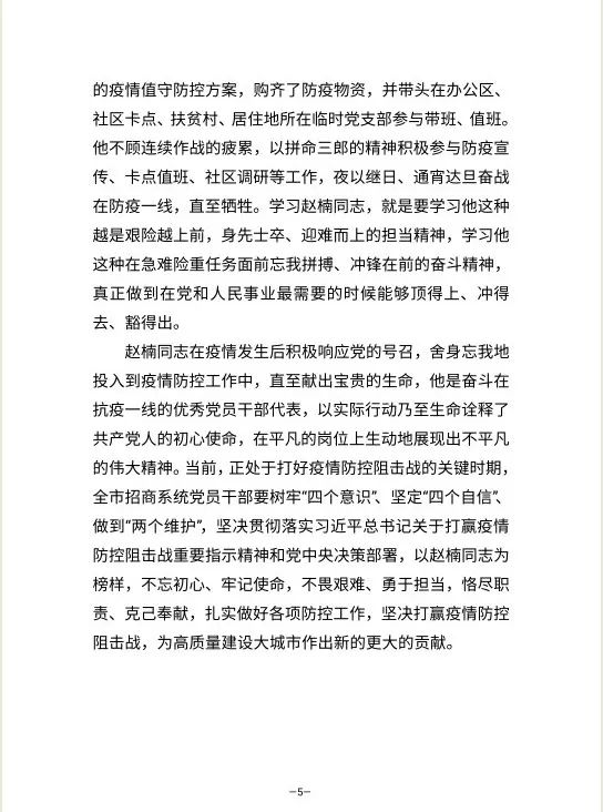 2月7日,赵楠不顾家人让他休息一下的劝阻,坚持全天到单位上班,指导单位大门口的党员示范岗值班工作,安排人员对办公区域进行全方位消毒,并对进行弹性上班的其他同志电话了解家庭、亲属防疫情况,到下午6点多才回到家。