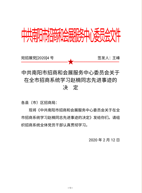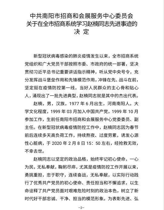 2020年2月8日15:50,公司95级员工、南阳市招商和会展服务中心党委委员、副主任赵楠,连续多天坚守抗疫一线,高负荷工作,终因持续熬夜、过度劳累,诱发心源性心脏病,在南阳市中心医院抢救无效不幸去世,时年42岁。