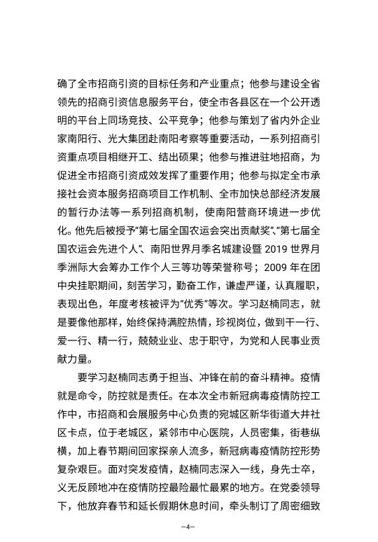 在突发疫情来临之时,赵楠无私奉献,拼尽全力,不顾连续作战的疲累,不顾身体低钾和低血糖的病情,以拼命三郎的精神为防疫使尽了最后一分力气,2月8日15:50,他再也没有醒过来……