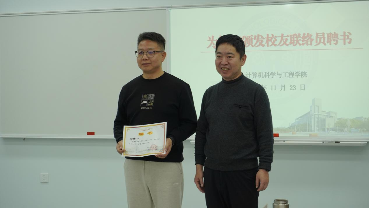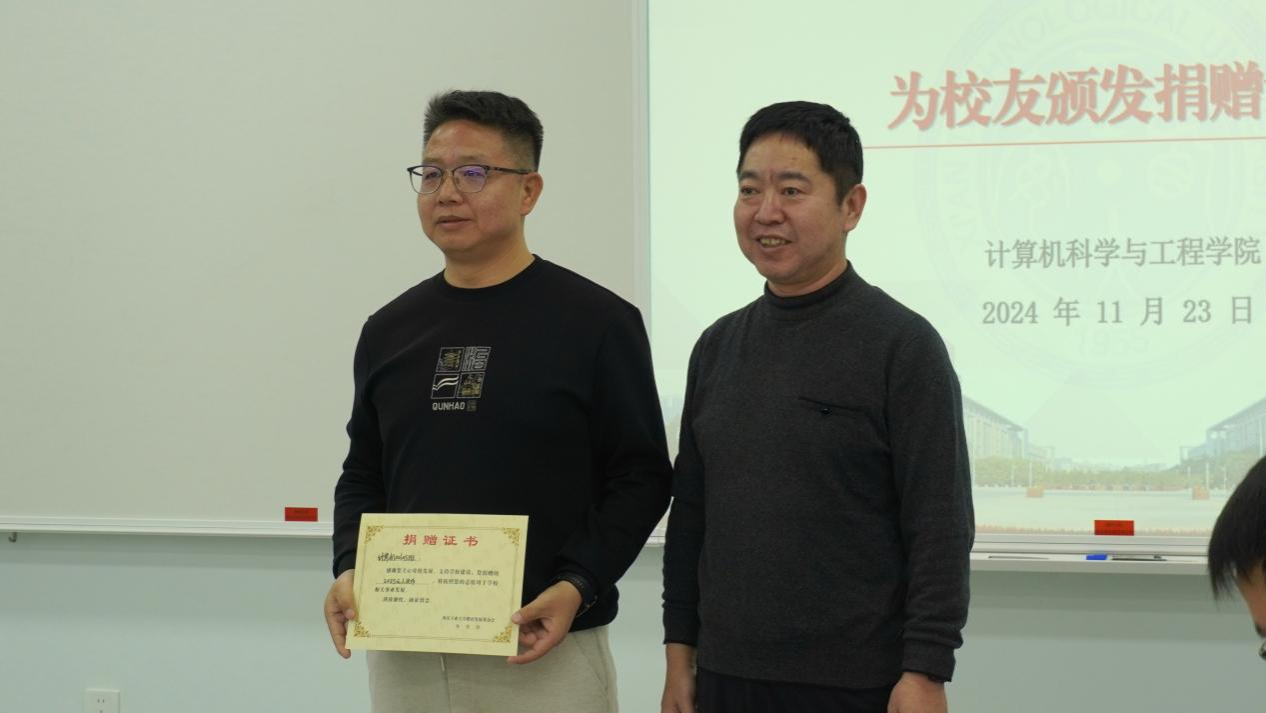期间,返校员工们集体认捐了双创楼报告座椅冠名项目,王守民为该班级颁发了捐赠证书,并员工郭伟颁发了00605班员工联络员聘书。